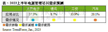 2023上半年除了为传统备货淡季,且消费电子需求依旧疲软,企业计划性削减资本支出,然在电源管理芯片龙头德仪(TI)RFAB2、LFAB产能陆续开出情况之下,TrendForce集邦咨询预估上半年全球电源管理芯片产能提升4.7%,对消费性电子、网通、工控等应用产品将持续带来降价压力,预期上半年报价续降5~10 %。